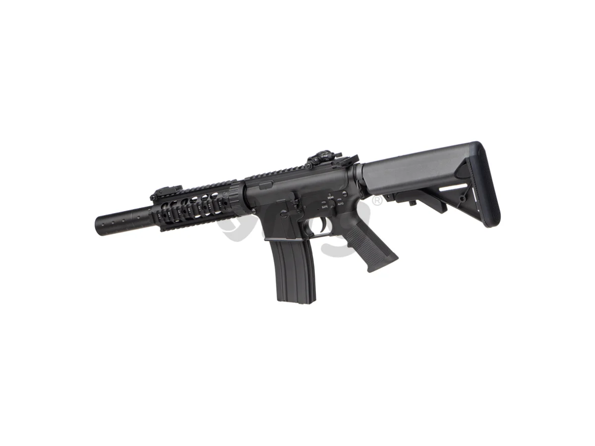 Asadar, va prezentam replica de airsoft M4 RIS Silencer QR 1.0 EGV fabricata de E&C . Realizata in intregime din metal dotata cu sine de 22mm in partea frontala pentru a putea atasa accesorii cum ar fi lanterna sau laser sau sisteme de ochire avansate. Calitatea finisajelor sunt de remarcat dat fiind segmentul din care fac parte aceste jucarii minunate. Asamblarea este buna iar materialele folosite sunt calitative.