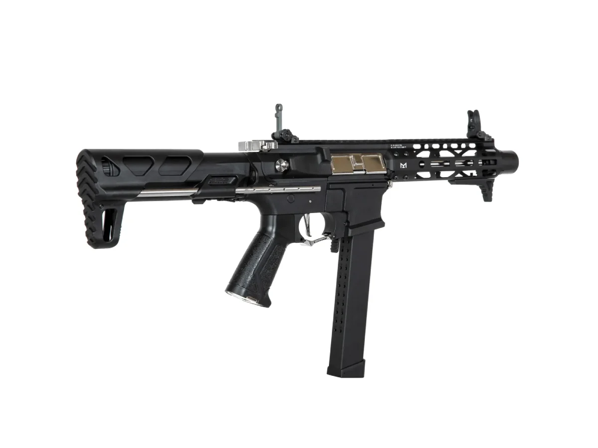 <p>ARP 9 2.0 un model original, fabricat de G&G si face parte din seria Combat Machine. Aceasta serie, CM, este gandita sa ofere modele accesibile, oferind in acelasi timp mecanisme interne de inalta calitate si utilizarea celor mai bune materiale posibile disponibile.</p> <p>Replica are o lungime de 600/660 mm, este livrata cu incarcator de tip mid cap si are o greutate de aprox. 2.2 kg. Este construita din polimer si aluminiu iar partea frontala este dotata cu sine de tip M-Lok si sina RIS in partea superioara ceea ce permite o vasta accesorizare. Intradevar, corpul replicii de airsoft este fabricat din material plastic. Este vorba de fibra de sticla ramforsata, pe care multi jucatori o considera mai rezistenta decat anumite metale utilizate pe alte replici de airsoft. Anumite elemente de legatura si anumite componente si accesorii sunt fabricate din metal, pentru a oferi replicii de airsoft o rezistenta imbunatatita. </p> <p>G&G a dotat aceasta replica cu noua generatie, gearbox v2, complet electronizat. Ansamblul tragaciului este inlocuit cu o unitate electronica prevazuta cu microcontacti, meniti sa ofere o fiabilitate mult imbunatatita fata de carbunii clasici. In partea din spate exista un mosfet potent, capabil sa sustina cu usurinta 11.1V LiPo. In afara de fiabilitatea mult imbunatatita, instalatia electronica avansata va contribui sa un consum mai mic a acumulatorului, un raspuns al tragaciului mult mai mic si gestionarea corecta a componentelor interne, prevenind uzura prematura. Cireasa de pe tor este reprezentata de posibilitatea de a implementa functia de burst de 3 bile in locul selectiei auto. Modificarea se realizeaza simplu, prin mentinerea apasata timp de 15 secunde pe modul semi a tragaciului. Componentele interne precum rotile, pistonul, arcul dar si alte componente sunt standard. Fiecare piesa care se doreste inlocuita trebuie verificata atent daca se potriveste sau nu.<br>Camera de hopup este fabricata din plastic iar nivelul de hopup este reglabil. Viteza replicii este de 105-110 metri pe secunda, masurata cu bile de 0.20g. Reglajul hopup-ului este situat in interiorul portului ejector. Pentru acces este necesara actionarea parghiei de armare.</p>